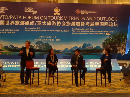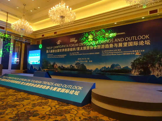 第八届联合国世界旅游组织/亚太旅游协会旅游趋势与展望国际论坛13日-15日在桂林香格里拉酒店召开。在第一天的技术会议中,与会人员紧紧围绕“旅游跨界与融合”这个主题展开讨论,分享各自的观点与看法,研讨全球各地旅游目的地和客源国的旅游发展经验、问题和事宜以及挑战。