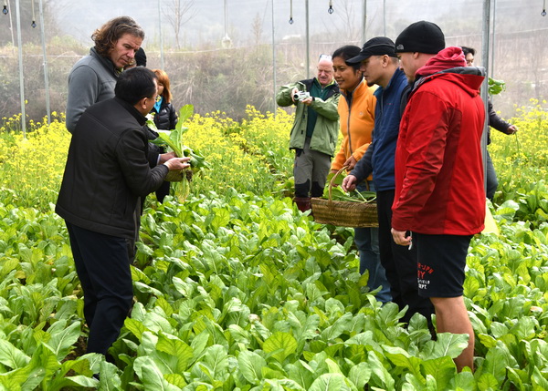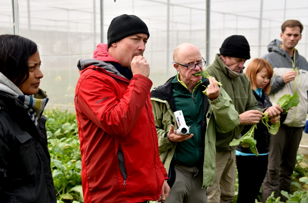 外国专家们在基地当场试吃有机蔬菜-吕建伟摄