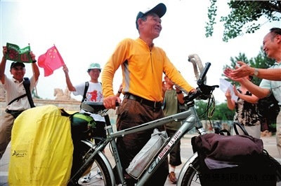 烈日下,黄衫老者翩翩一骑疾驰而来,守候在元大都遗址公园的拉拉队报以热烈的欢呼声。20日下午两点,日本静冈县的63岁老人影山淳抵达北京,完成了他的自行车之旅。8年间,影山淳分段探访了马可·波罗的足迹,跨越6个国家,行程约1.4万公里。