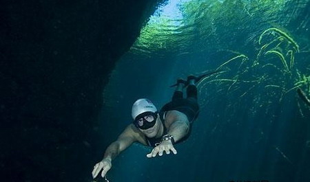 所谓自由潜水,就是不依靠氧气瓶等呼吸设备潜入水下。那些岩洞自由潜水者,需要从能见度低、地形弯弯曲曲并且洋流激荡的海底岩洞中间通过。此前这一危险运动的世界纪录是120米,由一名澳大利亚自由潜水者在2009年8月创造。