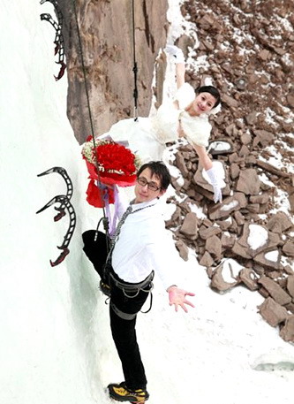 近日,唐山户外运动爱好者咪姆和她的恋人大漠在秦皇岛祖山冰壁间的一组独特的婚纱照和新婚MV在网上引起了不小的轰动,其以高难度的冰壁攀爬和国内首创的冰壁婚纱摄影被誉为国内最牛的爱情留影。