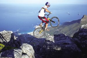 这些惊人的照片不是PS(PS是电脑修图软件photoshop的缩写)来的,28岁的比利时职业自行车手肯尼·比利确实做出生死一线间的冒险特技,他在南非开普敦桌山1048米的花岗岩悬崖上,表演了自行车特技。