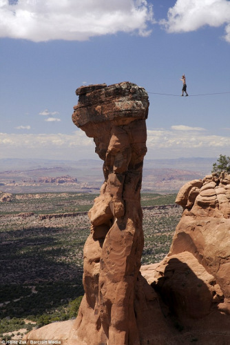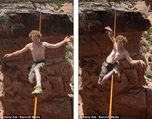 据称,24岁的安迪·刘易斯(Andy Lewis)将走扁带固定在公园里深30米的峡谷之上,然后不靠任何安全装备,在这条长14米的尼龙带上面行走,其间还做了高难度的屈膝动作。