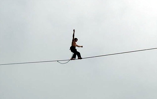 值得注意的是,这种绳索并不是像钢丝那样完全拉紧的,而是像一个窄的蹦床,给上面行走的人以伸展和跳跃的感觉,从而需要表演者具有更高的平衡技巧。