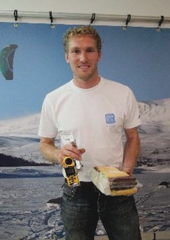 10月18日,在比利时首都布鲁塞尔,比利时极地探险家萨姆·德尔图尔向人们介绍探险将用到的电子高度仪和创新极地食品。