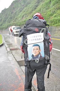 游国芳背着重十多公斤的行囊,并挂上儿子照片,“爸爸带你去徒步环岛旅行”,彷佛儿子真背在身上,父子同行,一路心中默念“南无阿弥陀佛”。