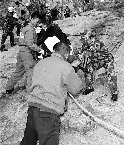 昨日清晨,救援人员利用绳索将被困的33名大学生营救下山。
