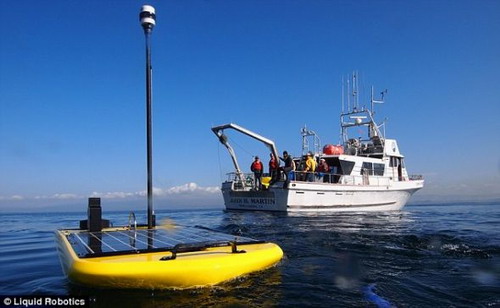 波浪滑翔机24日从美国旧金山出发,将一路驶往夏威夷。一旦抵达特定位置,它们将与驶往澳大利亚和日本的另外两艘船只汇合。波浪滑翔机由固定在一个被水淹没的有翼平面上的一个漂浮平台组成。它们表面覆盖的太阳能电池可为波浪滑翔机提供动力。它们利用波浪的动力驱动水下鳍状物和一个GPS装置。公众可以随时查阅这些无人驾驶船传输给海洋展的基本数据读数。研究人员也可对它们收集的信息进行研究。