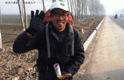 18日上午,一位头戴白色鸭舌帽,背着一个大旅行包的行者手里拿着一份中国地图,步履矫健的行走在衡水冀枣路(冀州到枣强)上。他,叫金世明,今年已经60岁,从2005年8月16日起,已经徒步行走77100多公里,走过1835个县市,并欲打破吉尼斯世界纪录,被人称为“中国阿甘”。